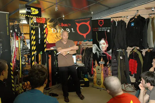 Cette journée tournée sur le thème de la marque BEAL, s’est déroulée le samedi 12 Mai 2012, au magasin Le Yéti. Il s’agissait d’une journée permettant à quelques-uns de bénéficier, le matin, d’une formation aux côtés de Renald QUATREHOMME sur les cordes et les facteurs de risques, leur fabrication et leur utilisation, leurs forces de choc, les facteurs de chutes, les problèmes de frottements, la résistance , l’élasticité…