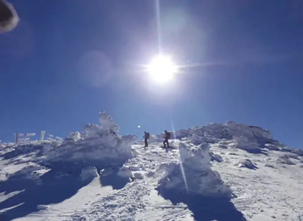 L’ambiance est bien joyeuse, tous les quatre ravis d’avoir trouvé ce créneau commun, nous faisons abstraction de la foule pour s’exalter devant la jolie forêt enneigée, puis les arbres presque sculptés par la glace et enfin la vue du sommet.