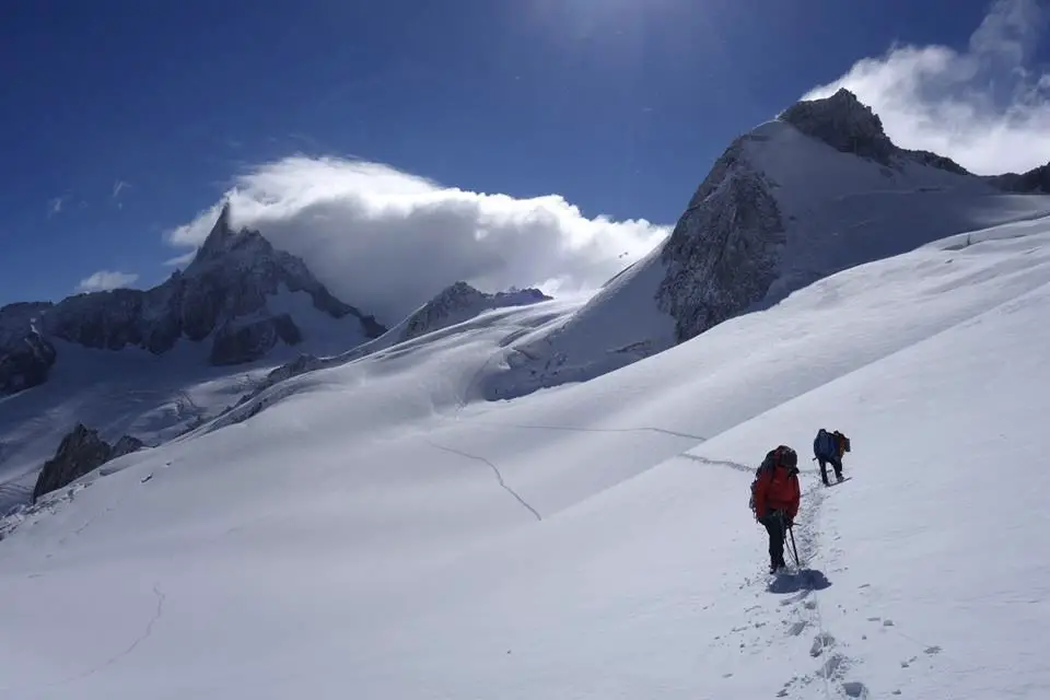Nous remontons au milieu des volutes de nuages, le paysage est toujours aussi beau. A mesure que nous avançons, nos muscles consomment de l’énergie et notre corps se réchauffe. Nous avons presque trop chaud lorsque nous arrivons au milieu des touristes italiens à la pointe Helbronner. Nous descendons avec en tête la perspectives d’autres escalades… Ce n’est pas fini.