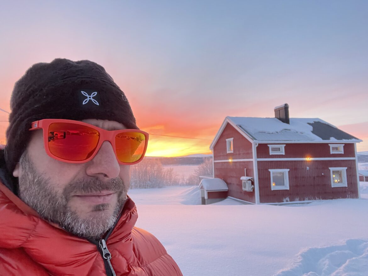 Les lumières du soleil sont très particulières en laponie l’hiver. Elles sont rasantes et le soleil est souvent discret sauf sur certaines journées comme celle-ci avec un paysage rougeoyant comme la couleur des verres des lunettes.