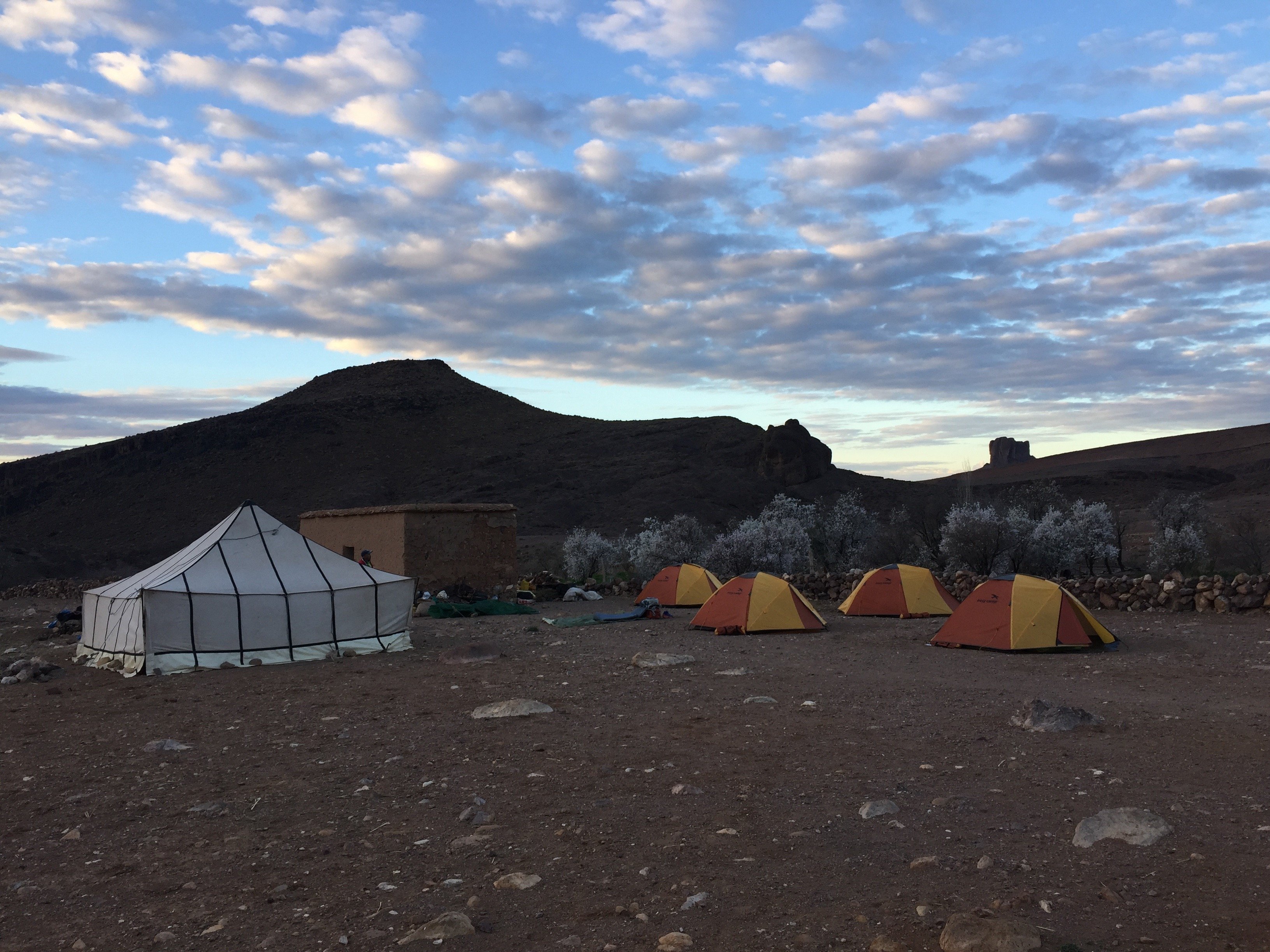 Après une longue journée de bus, nous voila arrivé au campement vers 18H. L’équipe des muletiers nous attends. Ils sont 4 : Zaid ( leur chef ), Lhoussame, Mimoune et Ismaël ( le plus jeune 16-17 ans). A peine sortie du bus, ils récupèrent tente Mess et celle du cuistot pour la monter vite. Notre chef cuisinier s’installe rapidement en cuisine pour nous préparer un thé à la menthe accompagné de quelques biscuits pour nous faire patienter le diner.